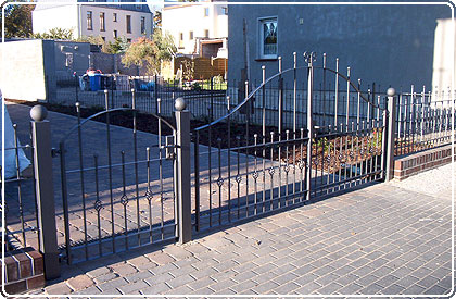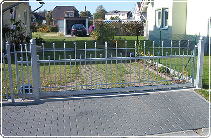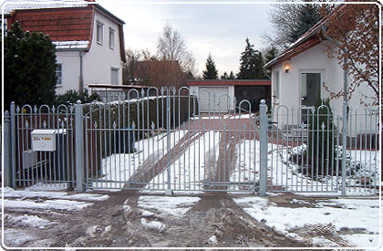 Zaun Bianca in Vierraden bei Angermünde (Brandenburg) mit Kugel-Spitzen, verzinkt, mit Schiebetor Typ A
