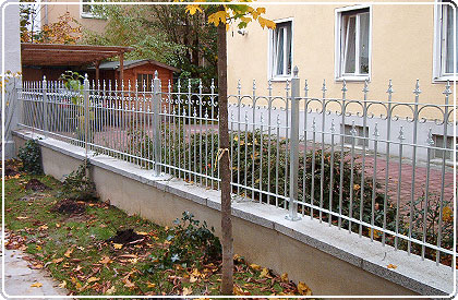 Gartenzaun Henrietta in München mit gemauertem Sockel, feuerverzinkt, Spitze Nr. 4
